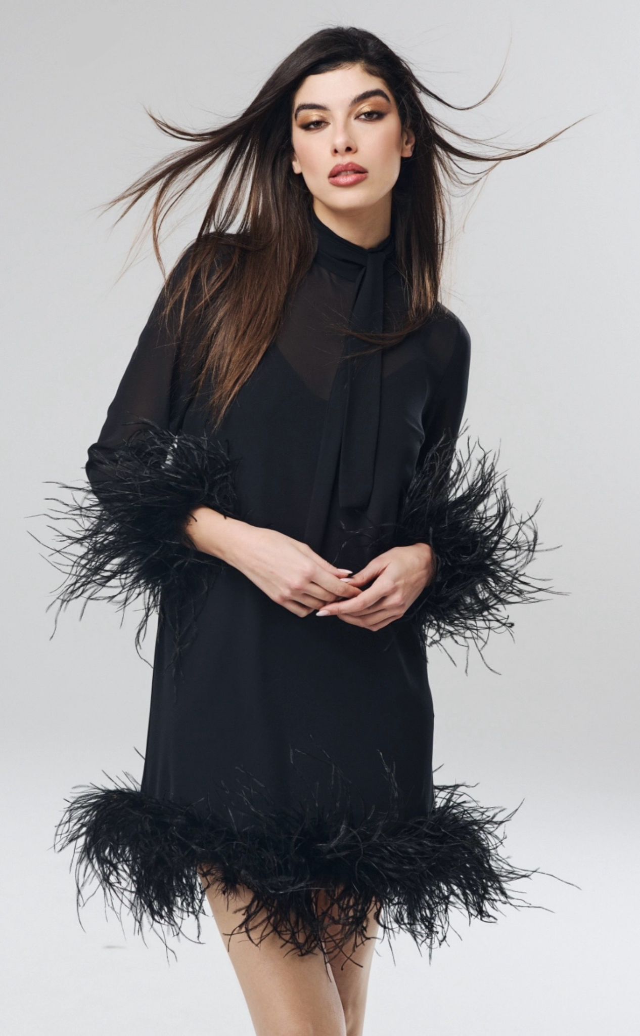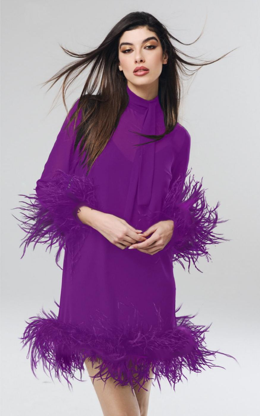 Il dettaglio protagonista? La cascata di piume tono su tono che scende lungo la gonna, creando un gioco di volumi e leggerezza che cattura lo sguardo a ogni passo.