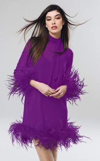 L'elemento distintivo sono le decorazioni in piume nere che adornano i polsi delle maniche e l'orlo della gonna, dando un tocco glamour e sbarazzino. Sotto. Il tessuto dell’abito è leggero e fluido, con una linea dritta che cade morbida sul corpo.