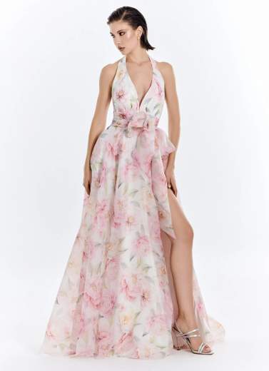 Abito da Gran Galà "Ninfea" – Silk Organza con Stampa FlorealeEmana un'eleganza eterea con l'abito Ninfea, un capolavoro di leggerezza e romanticismo. Realizzato in pregiata organza di seta, questo abito lungo si distingue per la sua delicata stampa floreale nei toni del rosa cipria e peonia su base avorio.