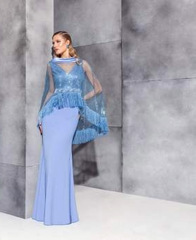 Raffinato e scenografico, questo abito longuette è pensato per chi desidera un’eleganza sofisticata e contemporanea. La silhouette aderente valorizza le forme con linee pulite e femminili, mentre la mantella in chiffon fluido crea un effetto leggero e armonioso ad ogni movimento.