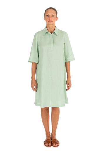 Abito corto in puro lino tinta unita, con linea svasata e maniche a tre quarti. Il collo a camicia con apertura a V dona un tocco moderno e rilassato, mentre il taglio fluido valorizza la figura con naturalezza.Codice