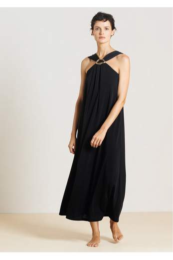 Abito lungo fluido, con scollo all’americana incrociato e dettaglio gioiello dorato centrale che illumina il décolleté. Il taglio morbido e leggermente svasato valorizza la figura con eleganza.