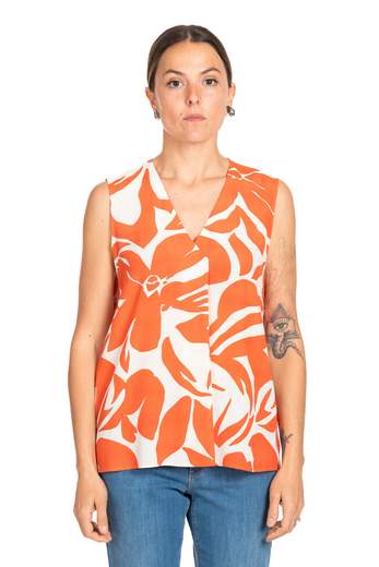 Top senza maniche in marocaine stampato con scollo a V e piega centrale che dona movimento alla linea. Un capo fresco e colorato, perfetto per aggiungere un tocco di allegria al guardaroba estivo.Codice