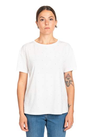 •T-shirt in jersey di cotone con micro strass applicati tonosul davanti. Il taglio dritto e il girocollo classico la rendono essenziale ma con un tocco di luce discreta.