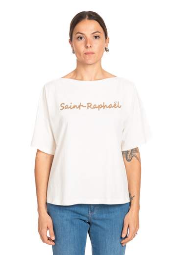 •T-shirt in jersey di cotone con scollo ampio e maniche corte dal taglio morbido. La scritta ricamata sul davanti aggiunge un dettaglio grafico dal gusto raffinato e vacanziero.Codice