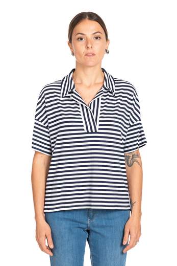 •Maglia in jersey a righe con scollo a V profilato e colletto a camicia per un’eleganza disinvolta. La costruzione over dona comfort e uno stile contemporaneo.Codice