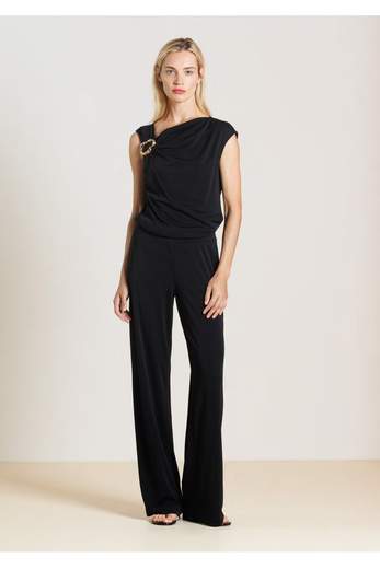 Top in jersey tecnico con spalla scoperta e dettaglio gioiello dorato che illumina il décolleté con eleganza. La drappeggiatura morbida crea un effetto fluido e femminile, perfetto per valorizzare la silhouette.Codice