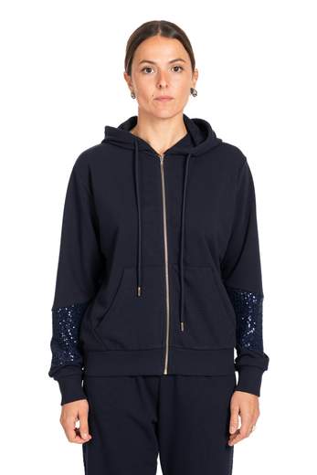 •Felpa con cappuccio in jersey , impreziosita da bande di paillettes tono su tono applicate sulle maniche. Chiusura frontale con zip in metallo e tasche a marsupio, per un tocco sport-chic dal carattere distintivo.Codice
