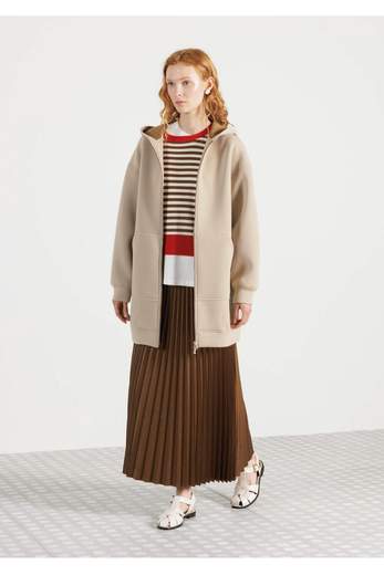 FELPA•Felpa lunga in scuba con cappuccio,modello lungo e zippato. Tasca applicato a marsupio.Linea morbida e femminile, look casual ma curato nei dettagli