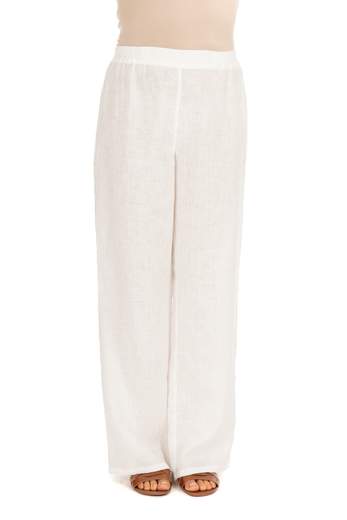 Pantalone ampio in puro lino, caratterizzato da una linea dritta e fluida che valorizza la figura con naturalezza. La fascia elastica laterale in vita assicura massimo comfort e una vestibilità adattabile.