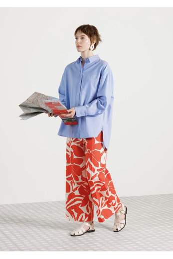 PANTALONE FANTASIA•Pantaloni cropped a gamba ampia con fantasia,realizzati in tessuto stuoia.Vita regolare con chiusura invisibile per una silhouette pulita e moderna. Un capo grafico e di tendenza, perfetto per look contemporanei dal carattere deciso.
