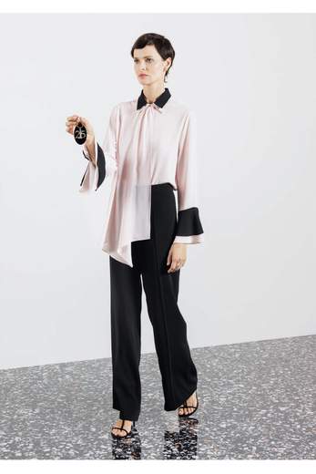 PANTALONE A ZAMPAPantaloni eleganti a zampa in cady, dal gusto sofisticato ed elegante. La piega stirata e la chiusura frontale completano il design con eleganza