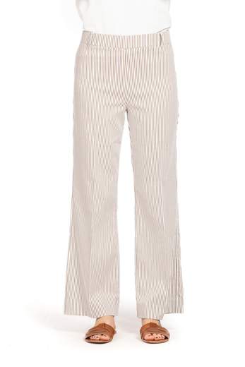 PANTALONE•Pantalone ampio in bengalina tinto filo, decorato da una raffinata fantasia a righe verticali.La linea fluida con gamba dritta e vita regolare dona slancio alla figura e si presta a interpretazioni estive dal gusto fresco e naturale.