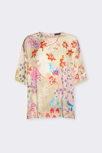 BLUSA IN TWILLBlusa in twill di viscosa stampato, con un fit ripreso dal mondo delle t-shirt girocollo, con spalla scesa e manica corta, ma reintermpretato in chiave raffinata e chic. Chiusura con goccia dietro.