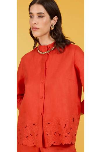 Delicata nei dettagli e fresca nella linea, questa camicia in puro lino è un vero passe-partout estivo. Il taglio svasato e il collo alla coreana donano movimento e modernità. . Il ricamo floreale sul fondo impreziosisce il capo con una nota femminile e naturale. Da indossare con pantaloni cropped o gonne ampie per un look raffinato e senza tempo.Codice