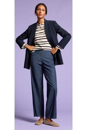 Jeans pull on carrot, realizzato in chambrè, dalla consistenza leggera e dal touch morbido dato dal semplice lavaggio blu scuro. Il modello moderno dalla gamba morbida stringe leggermente sul fondo. I tagli laterali sul davanti e le tasche inserite snelliscono e slanciano la silhouette. La vita si presenta liscia sul davanti ed elasticata sul dietro.