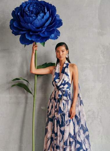 Dalla maestria sartoriale di Giada Curti, nasce un abito che è un inno alla femminilità e alla ricercatezza. Questo capo unisce la leggerezza impalpabile dello chiffon a una stampa floreale macro, cifra stilistica della designer, per un look che incanta al primo sguardo.