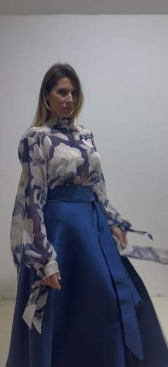 Stampa Esclusiva Magnolia: La camicetta presenta l'iconica stampa floreale "Macro Bloom" nei toni del blu notte e bianco seta, un segno distintivo delle collezioni Giada Curti.