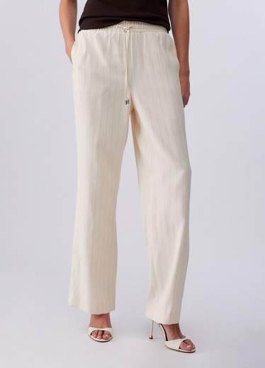 PANTALONE CON COULISQuesti pantaloni portano il tailoring in una versione più casual. La gamba cade dritta e morbida, animata dalla trama gessata su sfondo bianco, per un’eleganza quotidiana che resta impeccabile.