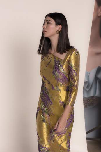 Abito jacquard oro con sfumatureQuesto abito da ospite è realizzato con una base in jacquard oro con sottili dettagli viola e verdi. Il design avvolge elegantemente la silhouette. La scollatura asimmetrica aggiunge modernità, mentre le maniche alla francese e il taglio aderente valorizzano la figura con precisione. Un capo pensato per le ospiti femminili che cercano raffinatezza e personalità.
