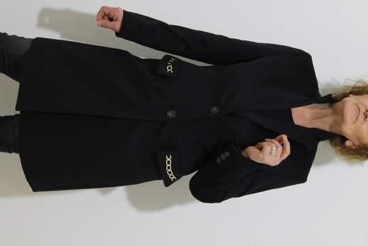 Presenta due tasche a filetto impreziosite da una piccola applicazione oro, che aggiunge un tocco elegante senza appesantire il design. La chiusura frontale abbottonata completa il modello, abbinata a un revers a lancia nero per un look essenziale e raffinato.