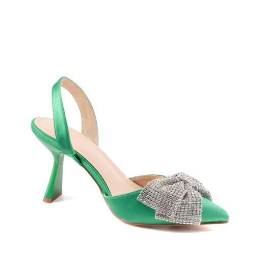 Descrizione: Stilosa slingback in satin con fiocco in cristal mesh e tacco laccato in matching color.Dimensioni: Altezza tacco 9 cm.