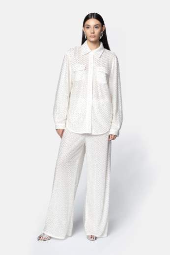 Pantalone dritto classico argento con bustino elastico a vita alta. Realizzato in tessuto tulle ricamato con paillettes e corallini. Interamente foderata.