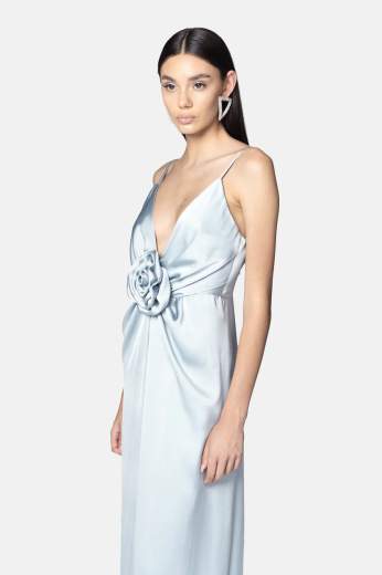 Abito lungo Saigon a sirena in tessuto satin, scollo a V profondo sul davanti, drappeggiato e terminate in un fiore al centro della scollatura. Linea aderente sui fianchi e morbido sul fondo, scollo profondo sul dietro.Codice