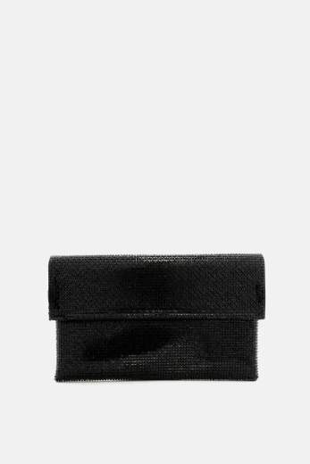 Foldover in materiale specchietto argento, chiusura con patta e tracolla sottile in metallo.